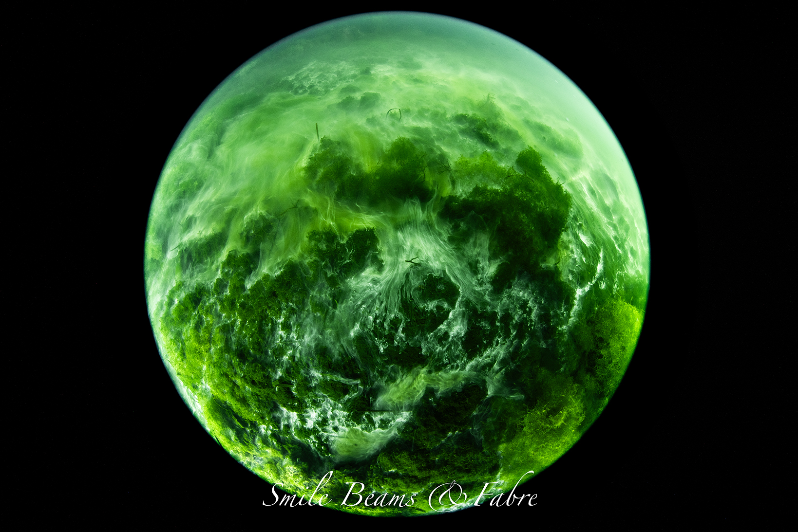 満潮から程なくして引き潮に入ると、海藻から迸るように放出が始まる、微動だにせずその場で待ち続けるとやがて白い煙のような胞子が線を帯びアートの世界へと変貌していく。