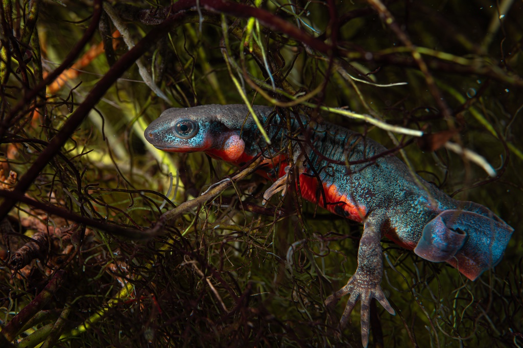 アカハライモリは繁殖時期を迎え、雄のブルーが美しい。