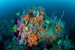 4つのブイそれぞれの根や岩に様相の異なるソフトコーラルがこんもり咲いています。