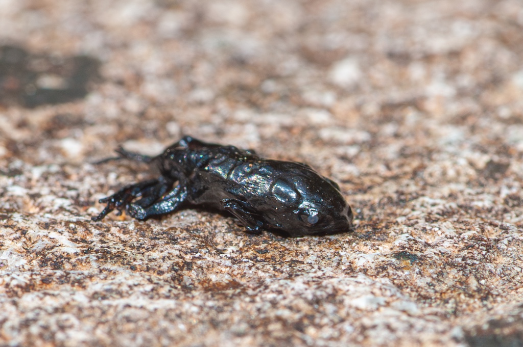 いよいよ上陸開始。体長は5mmくらい、尻尾が未だ残っています。上陸後は一週間、捕食活動はしません。しかし、この瞬間から、動くモノしか食べられなくなると言う、悲しいカエルの性。土中のトビムシ、ワラジムシの赤ちゃん、アブラムシなどを捕食していきます。オタマ時代は何でも食べられて楽だったのに。