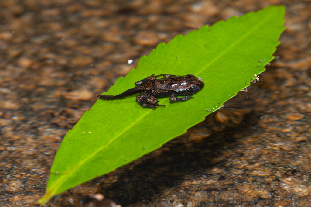 葉っぱボードに乗る子ガエル。可愛すぎる。