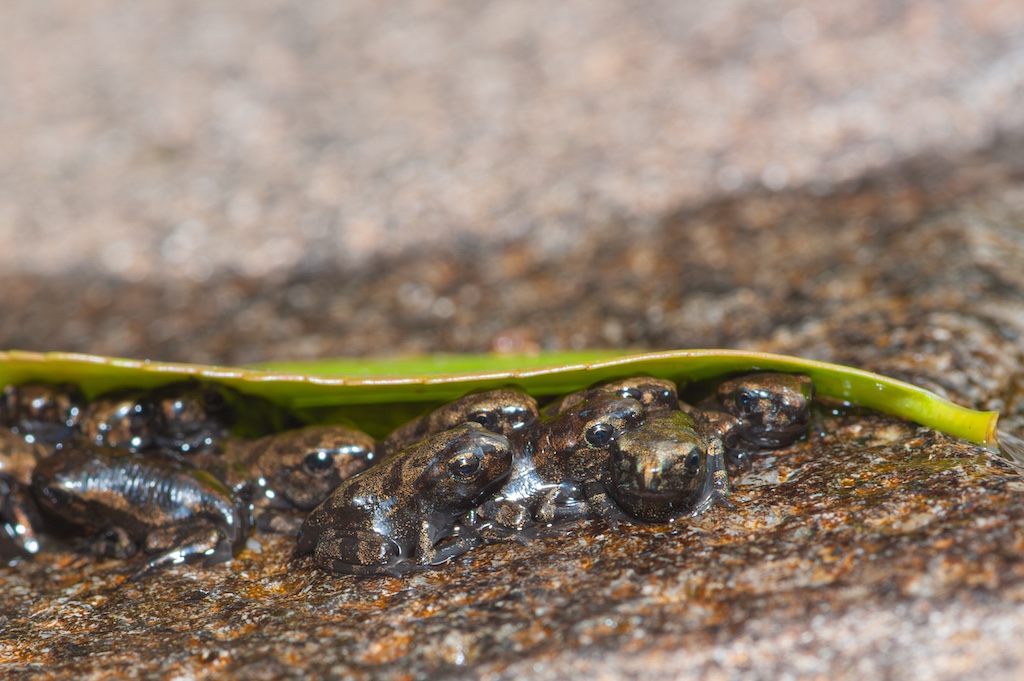 この子達は未だ生存率が高いグループ。小さな葉っぱに隠れて太陽光を防いでいます。彼らの大敵は乾燥。この時期の子ガエルは、表皮が薄くてデリケートです。賢い子しか生き残れないように、自然のふるいにかけらていきます。