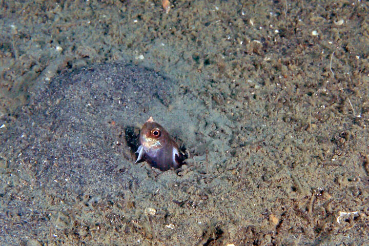 20cm前後のインドアカタチは、頻繁に巣穴の位置を変えるので、定点観察が難しいのですが、移動してもその周辺で見られることが多いので、同じ水深帯を海岸に対して平行に捜索すると遭遇することがあります