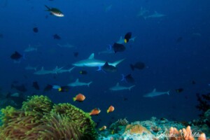 モルディブ固有のクマノミ達と一緒にグレイリーフの群れを観察中。