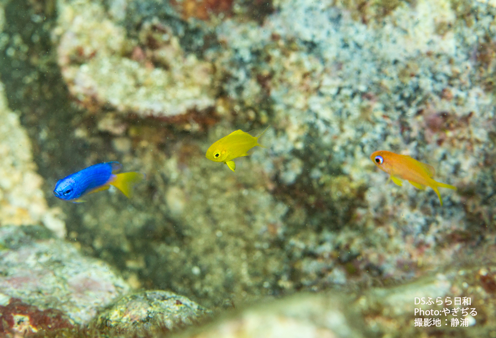 通年レギュラーのソラスズメダイ(左)キンギョハナダイ(右)に、真ん中の個体数の少ないコガネスズメダイの幼魚が加わり、色とりどりとなるこの季節。