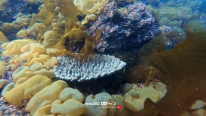 サンゴのまわりに海藻が生えてる。珍しい風景。