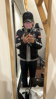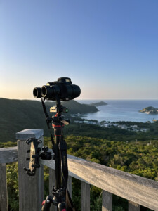 (双眼鏡6倍、8倍、10倍 三脚、コンパス、時計、スマホホルダー、マイク付きイヤフォン、無線、モバイルバッテリー等の装備を担いで高台の展望台に通っています。)