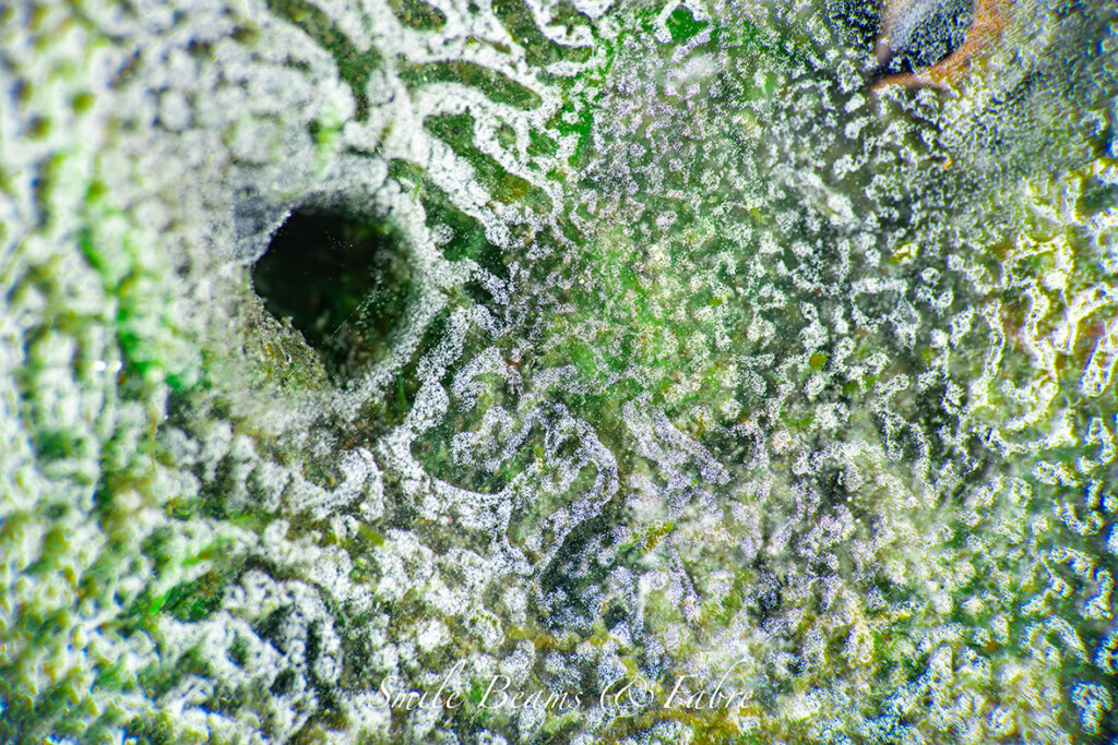 シオグサの仲間が胞子を放出後に傷み始めるとバクテリアに覆われることがあるようで、その様がなんともアートなのです。